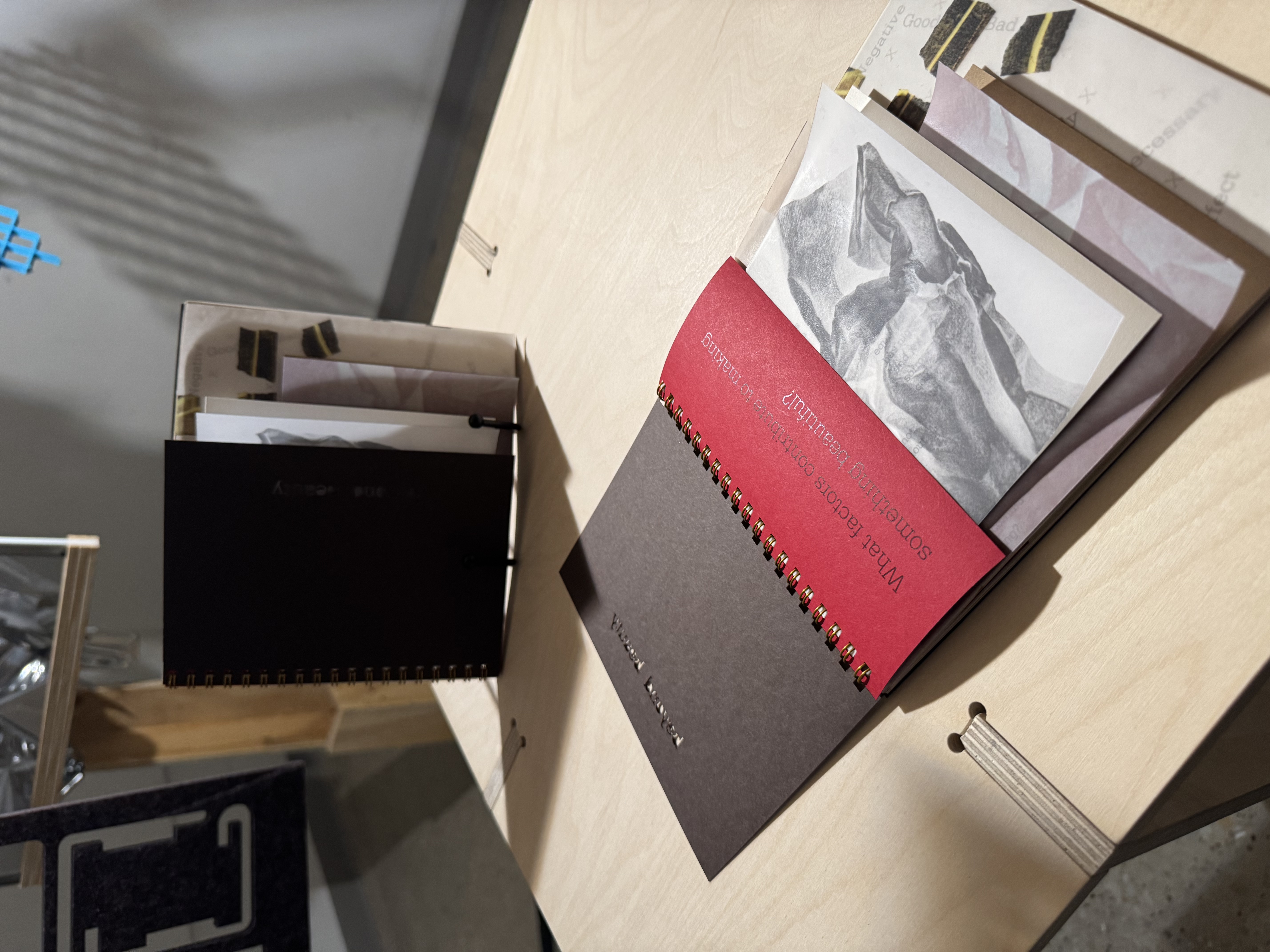 My book brings out the realness of the project in a way that I don’t think any other medium can show right now. It presents the idea through its pages, textures, and form in a very practical and direct way. While I do have an installation piece that acts as a model to represent my thesis, I feel that the book completes the whole story I am trying to tell. It adds more meaning and helps explain the concept better to the viewer. The book allows people to connect with the idea through something they can hold, see, and flip through, making the layered thoughts and perceptions I talk about feel more real and easier to understand.